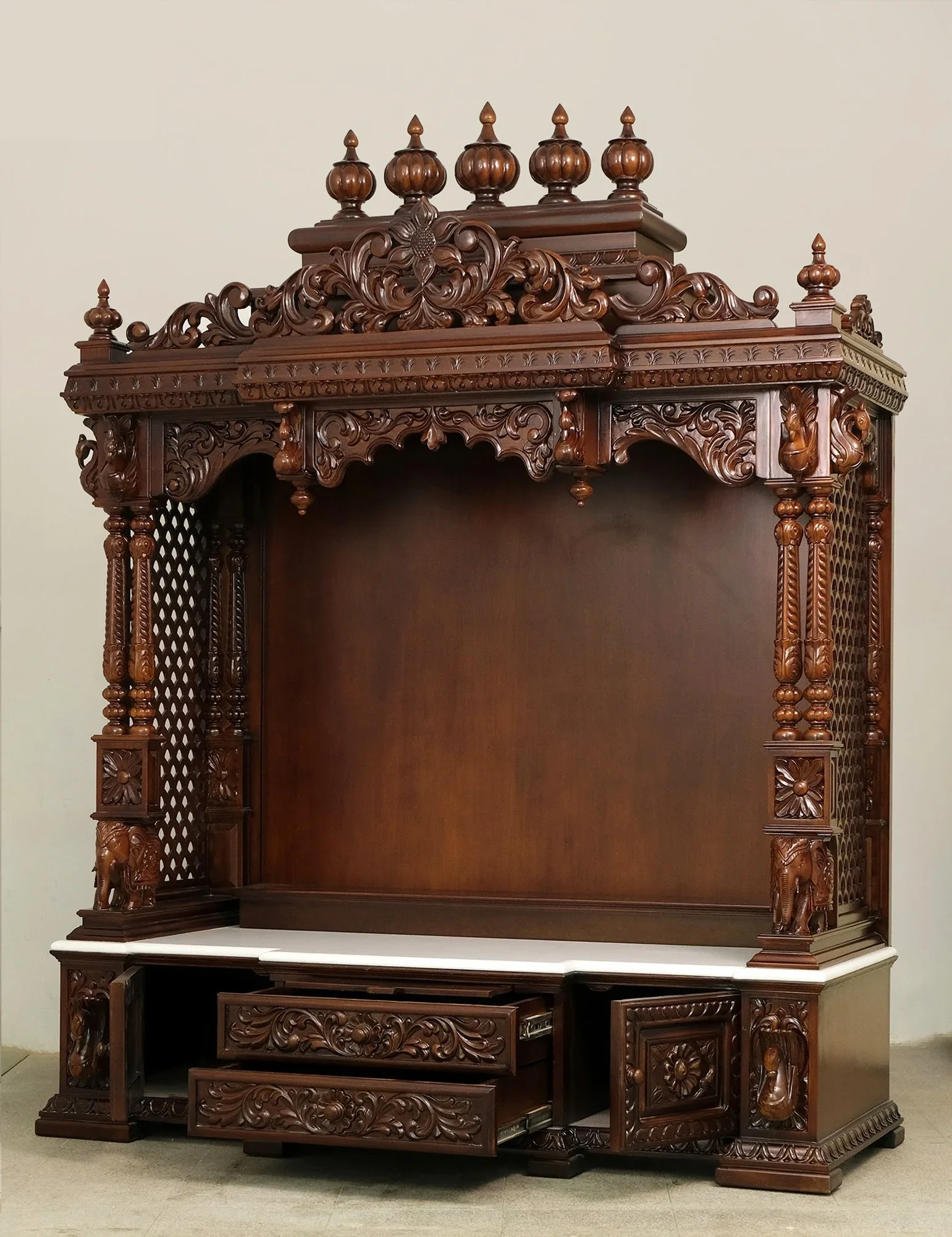 It is crafted from high quality wood with expert detailing, our wooden mandirs bring a timeless, holy feel to any home. They are ideal for those who value the traditional design and want a spiritual corner with a warm and rich look.